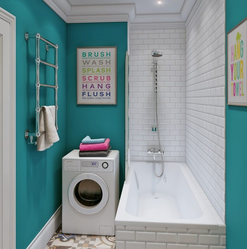 - The water supply and drain hoses of the washing machine can be hidden behind the bathtub. If there is no bathtub, they can be held inside the floor in a special groove.