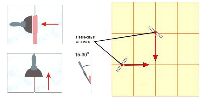 Grouting is done using a steel spatula or a pistol, which is more convenient. Then, with a rubber spatula, level the mixture flush with the plane of the tile surface. When filling the joints, care must be taken not to leave gaps. After grouting all joints, you need to wait until the whole mixture sets. After that, with a soft and completely squeezed sponge, it is necessary to make circular movements over the surface, smoothing the seams.