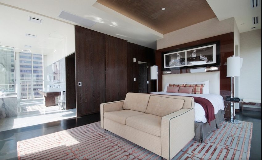 The bedroom is separated from the main room by sliding glass doors