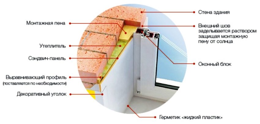 - assembly begins from the upper plane of the opening. The edges of the panel are well coated with glue. The width of the sticky layer should be at least 2 cm. One edge of the panel is inserted into the guide strip, and the other is pressed with force against the plane of the slope. Do the same with all three panels. In this case, the side ones are also inserted into the guides, which are screwed to the windowsill. All mating parts are processed with a sealant;