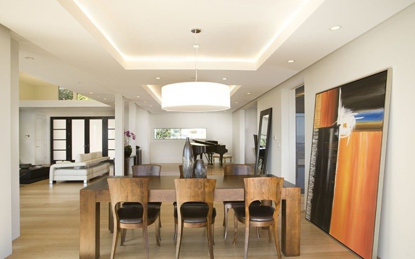The wires for a variety of fixtures can be easily hidden under drywall. The need for frequent cleaning of dust and a decrease in the height of the walls can be attributed to the disadvantages of plasterboard ceilings for the living room. A photo Some solutions show that in apartments where the ceilings are too low, multilevel suspended structures should not be made.