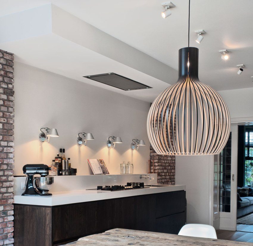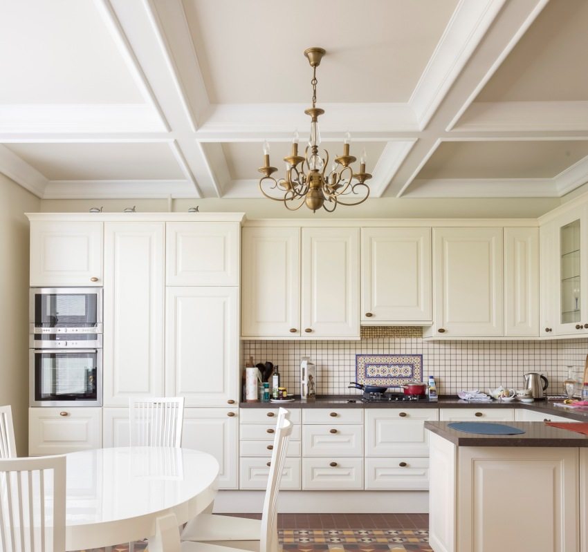 If the room is spacious enough with high ceilings, then they can be made multi-level with delimitation of the dining area and the place where food is prepared. In the case of a small kitchen, the ceiling can be arranged with one level, and the originality can be created thanks to various colors and lighting.