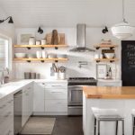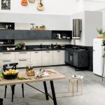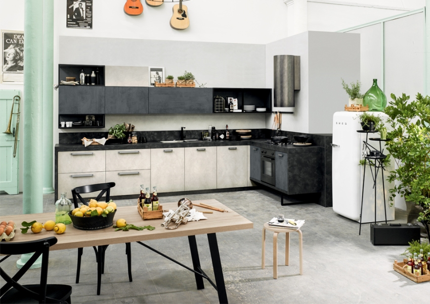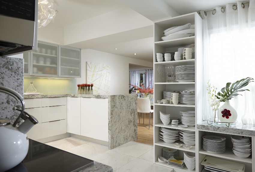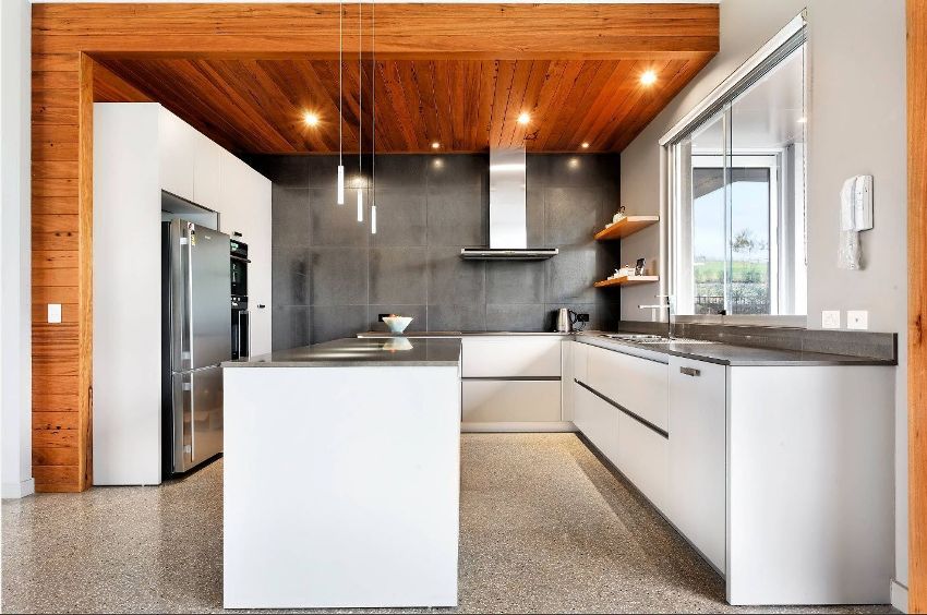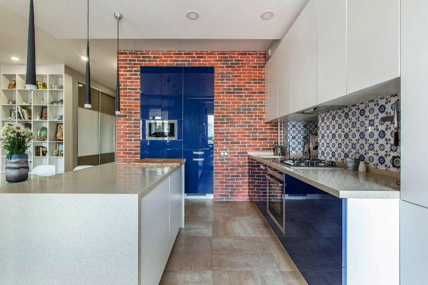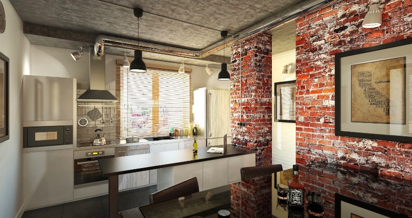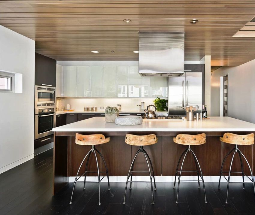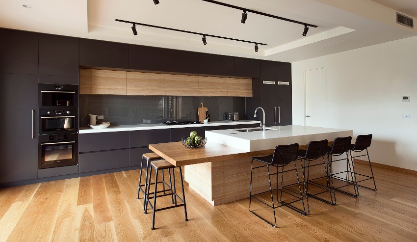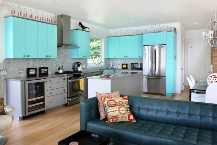 Furniture for the kitchen located in the common room is best bought to order, taking into account the individual characteristics of the room. As for the technology, it is recommended to purchase a built-in one, which can be easily integrated into the headset.