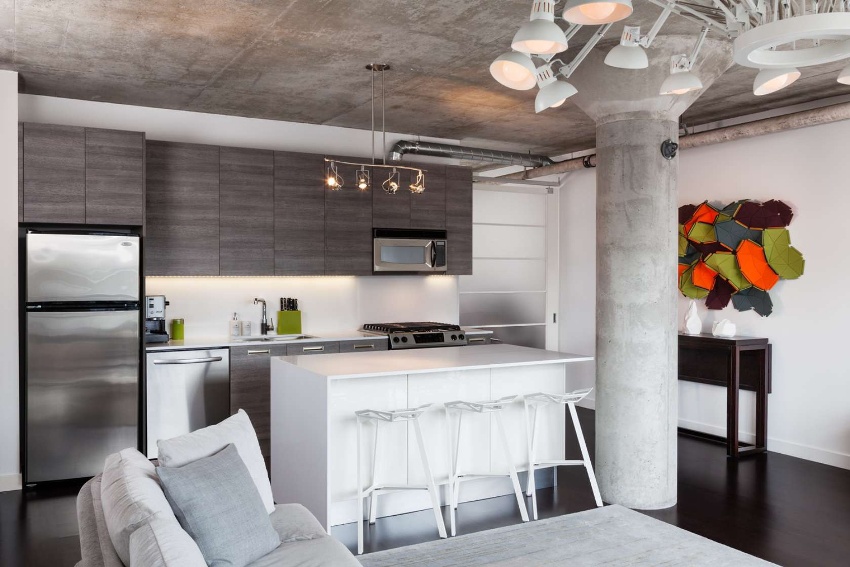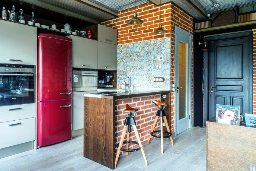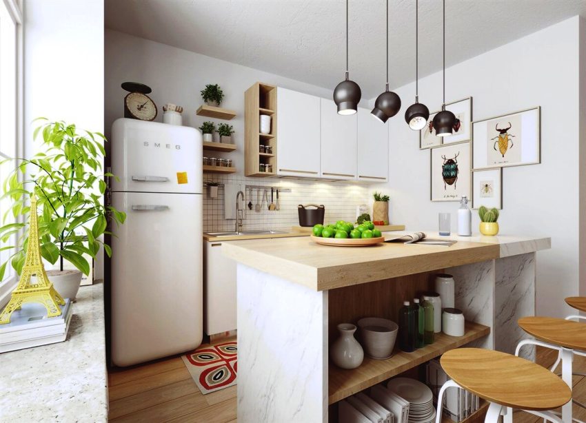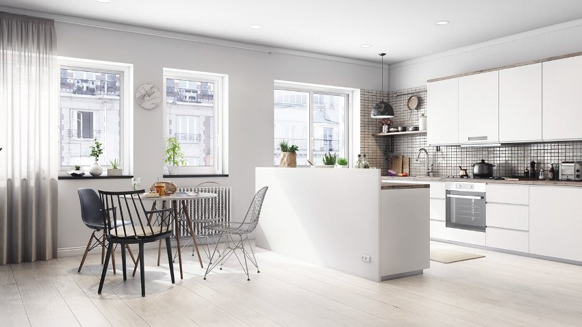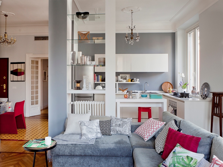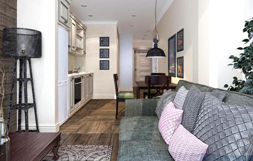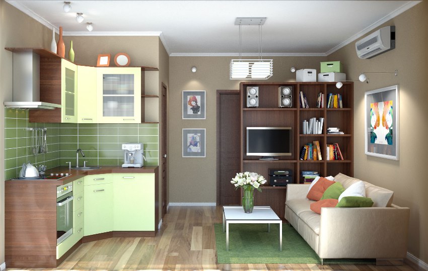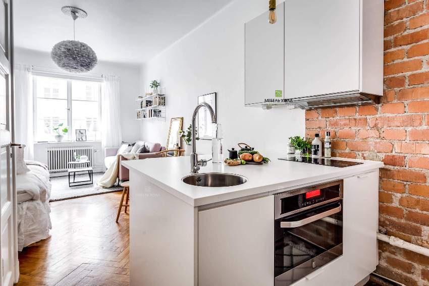 If you want to draw up a project for the redevelopment of a typical apartment with one room in a studio, then you will need to contact the specialists. The kitchen area in a studio apartment can be highlighted with flooring, laying tiles. Also preferred is LED lighting, which helps to segment the space.