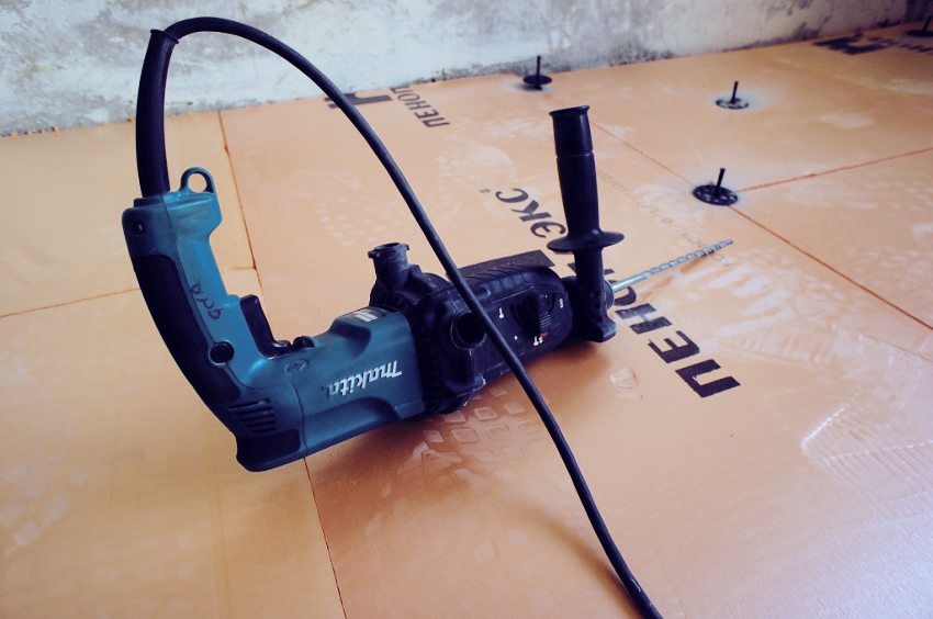 Then the first layer of insulation material is laid. If you have chosen penoplex, then start mounting the plates strictly from the corner. For this, holes are drilled in the concrete and plastic fasteners are installed in them (three pieces for one slab).