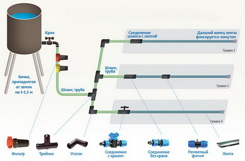 To distribute water, the main pipe is connected to the tank, from which branches follow to the irrigation points