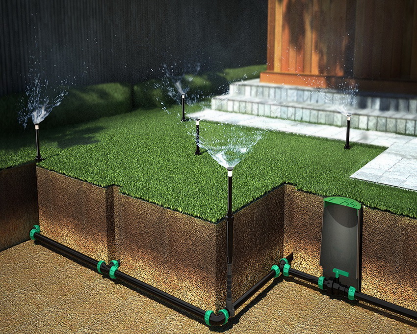 It is recommended to install the self-watering system of the lawn with your own hands in the fall in order to admire the green plantation in the spring. To lay the main and outlet pipes underground, a trench should be dug 30-40 cm deep, if the earth will not be plowed here in the future. Otherwise, the depth should be at least 50 cm. A crushed stone pillow is laid at the bottom of the trench, which will act as a drainage. If an air installation is expected, then it is required to prepare supports and fasteners for installation to the roof.