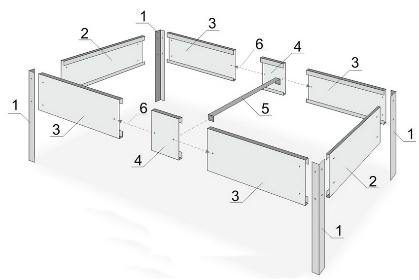 Bed assembly diagram: 1 - corner, 2 - transverse element, 3 - longitudinal element, 4 - connecting profile, 5 - tie, 6 - junction of the profiles of the longitudinal element and tie