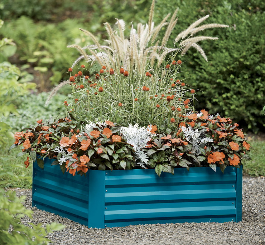 Steel beds are a great way to create a beautiful and neat vegetable garden on your site. To decorate such structures, you can use not only a colored coating, but also other means. For example, cover the bed with spunbond. Agrofibre in various shades can be found on sale. Canvases in white colors are recommended for use in the garden. Such a surface reflects the sun's rays well, excluding excessive overheating. For woody compositions and flower beds, you can choose any shade, the main thing is that it matches the landscape.