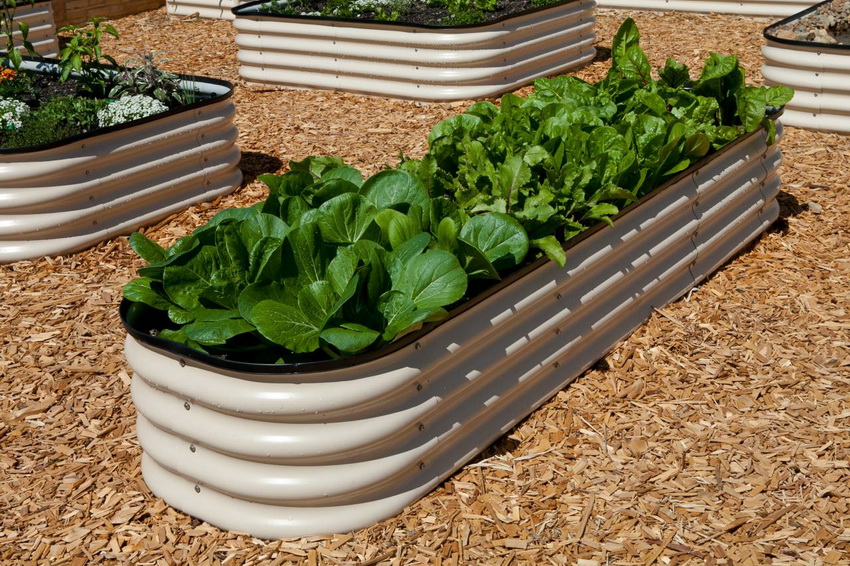 Metal beds are suitable for growing vegetables in a greenhouse or outdoors. The products are made of solid steel. The thickness of the sheet material is usually 0.5-0.55 mm. The surface is covered with a thin layer of zinc or polymer.