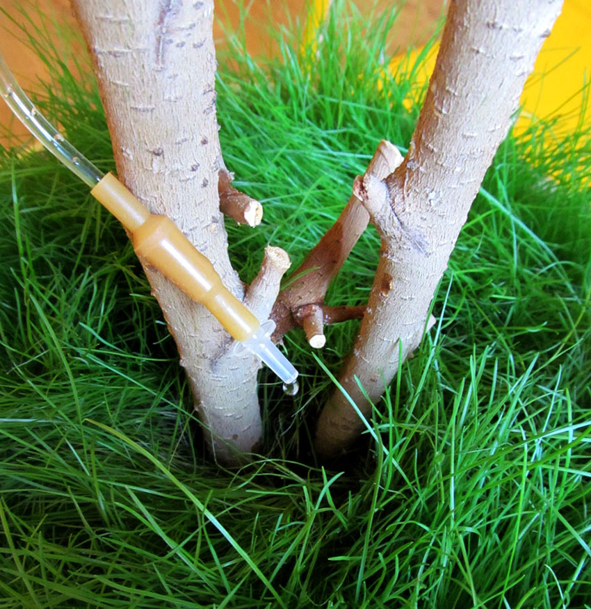 Another option, which is often used in a greenhouse, involves watering the plant at some distance. To do this, you should take a container of small volume and a regular ballpoint pen core, previously cleaned of paste residues with gasoline or solvent. One end of it is tightly closed with a toothpick or a match. Another is inserted into the opening of the bottle. It is better to seal the junction with plasticine.