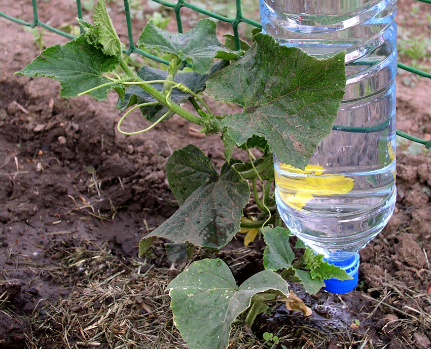 The most popular option for irrigation from a plastic bottle is dropping the container between the plants.