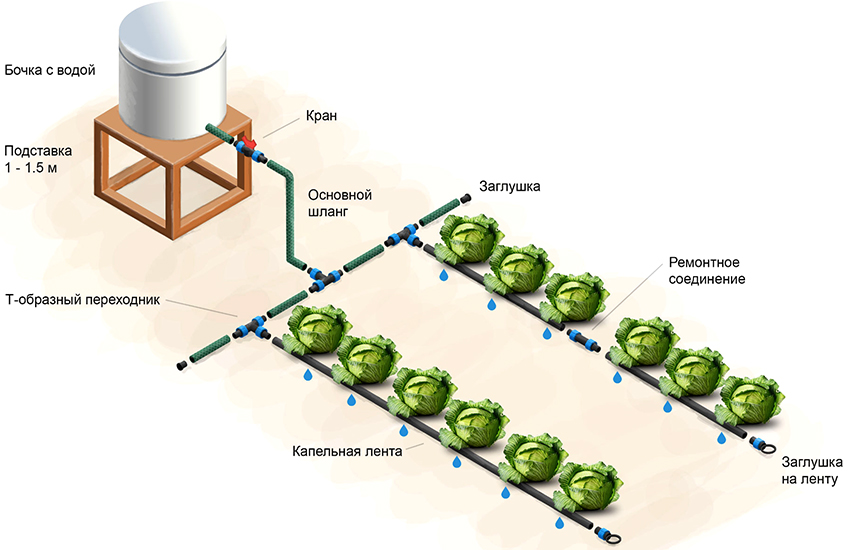 The installation of the system is preceded by the creation of a layout of all its constituent elements, and this, in turn, depends on the layout of the site and the location of the beds. The diagram should indicate the source of water supply, the main pipe and the outlet hoses so that you can calculate the amount of materials required. It is better to use a plastic barrel as a source of water supply for drip irrigation. This material does not corrode, which will not only increase the service life of the product, but also eliminate the possibility of clogging the system with rust particles.