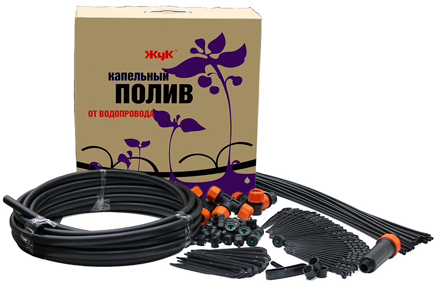 Drip irrigation system "Zhuk" from a domestic manufacturer is one of the most popular among gardeners. It can be connected to a centralized water supply or to a storage tank. If the latter option is used, the kit includes a level tube, through which you can control the amount of water remaining in the barrel. Manufacturers produce drip irrigation systems "Zhuk" for 60 plants and 30 plantings. Usually the device is equipped with a timer and a filter. You can additionally buy Beetle drip irrigation for 20 plants.