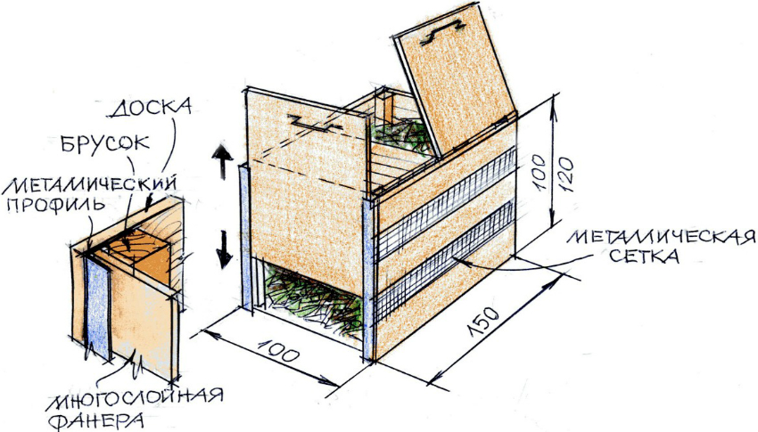 Depending on the individual wishes of the owner, the composter can be stationary or mobile (move on wheels). In this case, the recommended height of the box should not exceed 1 meter, and the size of each section should be about 1-1.5 meters.