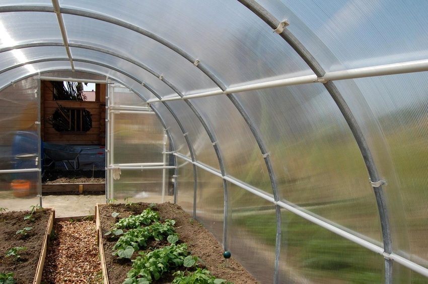 The advantages of this material include low weight, as well as resistance to mechanical stress. The transparency of polycarbonate is about 80-85%, which allows plants to receive the required amount of sunlight. At the same time, it is resistant to precipitation and cools slowly, keeping the heat inside the greenhouse longer.