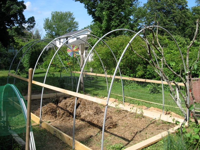It is important that after fixing, the timber is inclined towards the garden bed. The two ends of the elements located opposite each other are also fastened, which gives them the shape of a hut.