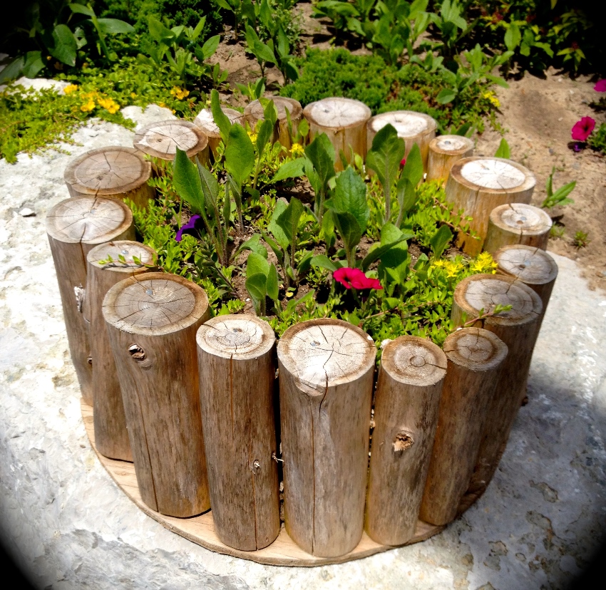 If the site has a tall stump or post, the pots can be fixed to it. In no case should you do this on a living tree. Products are fixed around the circumference in any order. The spiral looks beautiful from the side. You can also use the staggered potting technique. The only drawback of this bed is the inconvenient watering system.