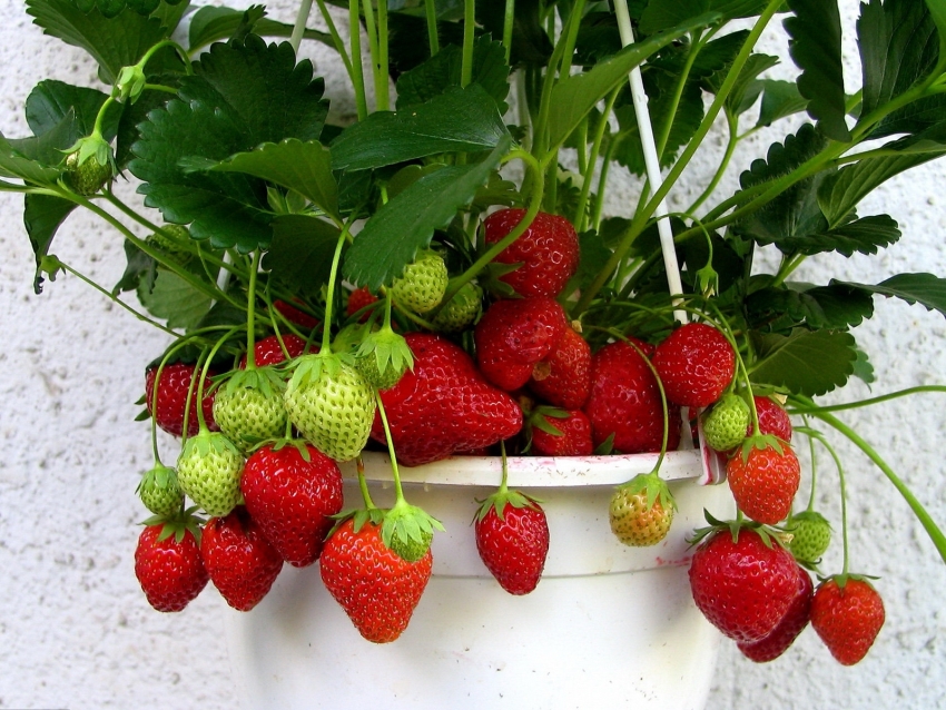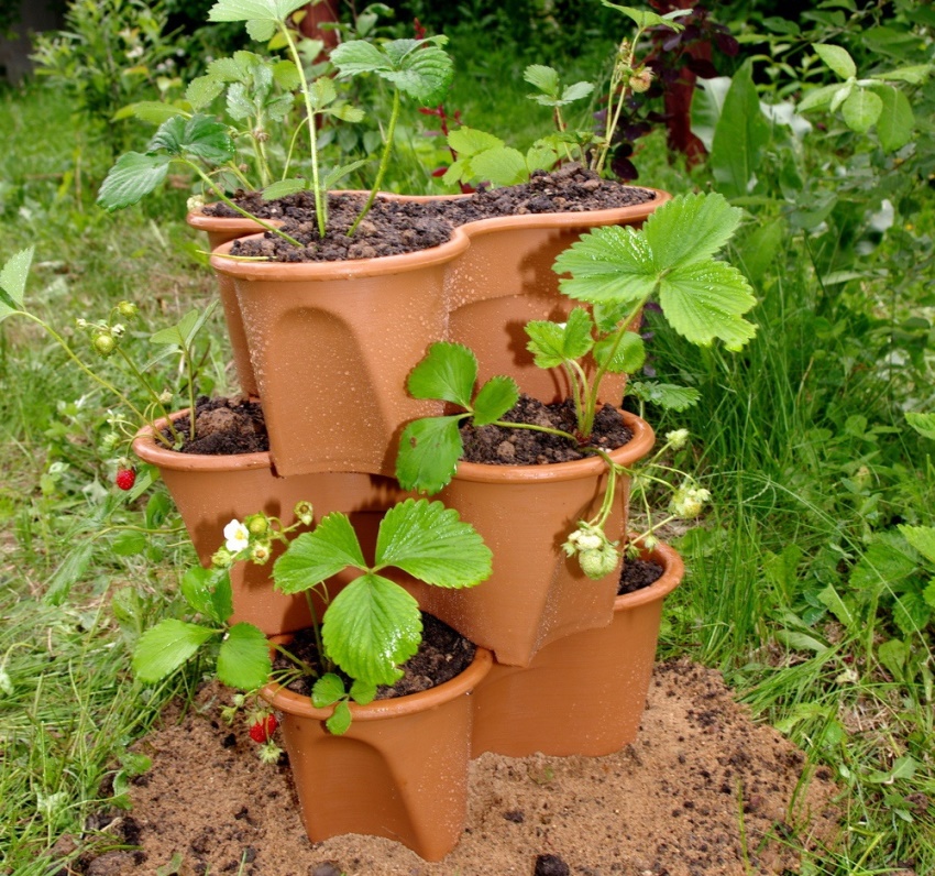 Flower pots can be used successfully for growing strawberries. Such designs have a decorative appearance. For work, clay or plastic products are suitable. As a result, the design is multilevel. The number of such levels is limited only by personal wishes. The pots are selected so that each subsequent one has a smaller diameter than the previous one. It is desirable that the difference in size between each pair of pots is approximately the same.