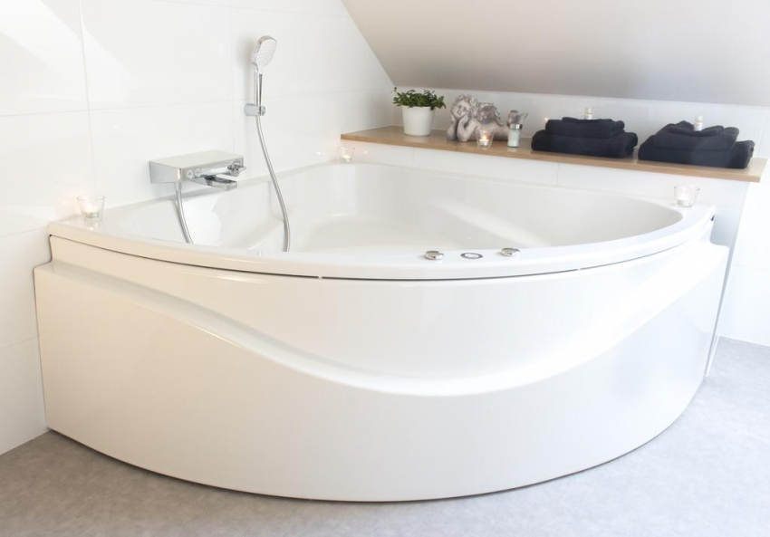 As the photos prove, corner acrylic bathtubs are very popular today, the sizes and prices of which are presented in a wide range, starting from 12 thousand rubles. and reaching 700 thousand rubles. This makes it possible to install the product in a room of any size with a different layout, without cluttering it. The bath can be left-handed or right-handed. The free side of the product can be concave, convex or rectangular. For large rooms, you can choose an overall model that resembles the shape of an isosceles triangle.