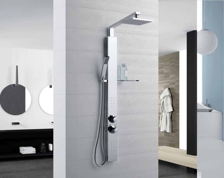 Shower panels are distinguished by a special design. They are also equipped with a watering can, a hose, a mixer, but they have a completely different - rectangular and volumetric rack-panel, additionally equipped with nozzles for massage functions.