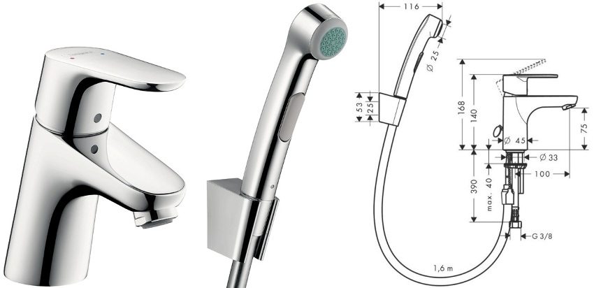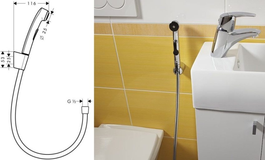 The design of a faucet with a hygienic shower (photos are presented on the manufacturers' websites) is no different from conventional washbasin faucets, except for the addition of a hose with a hand shower for a hygienic shower. The watering can is attached to the wall or to the toilet cistern, which makes it comfortable to use for hygienic purposes. I would like to note that mixer can function separately from the hygienic shower itself, since water flows into the shower only when a button is pressed on the shower itself.