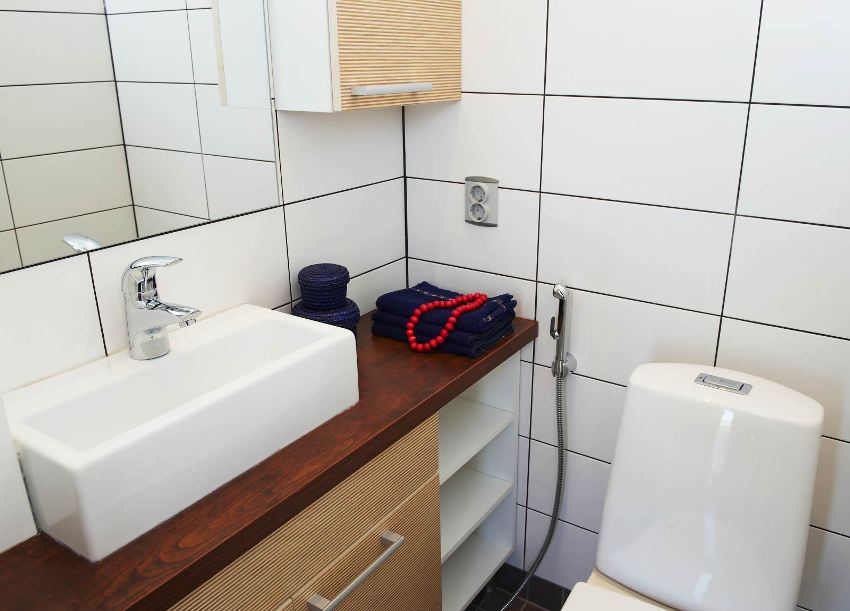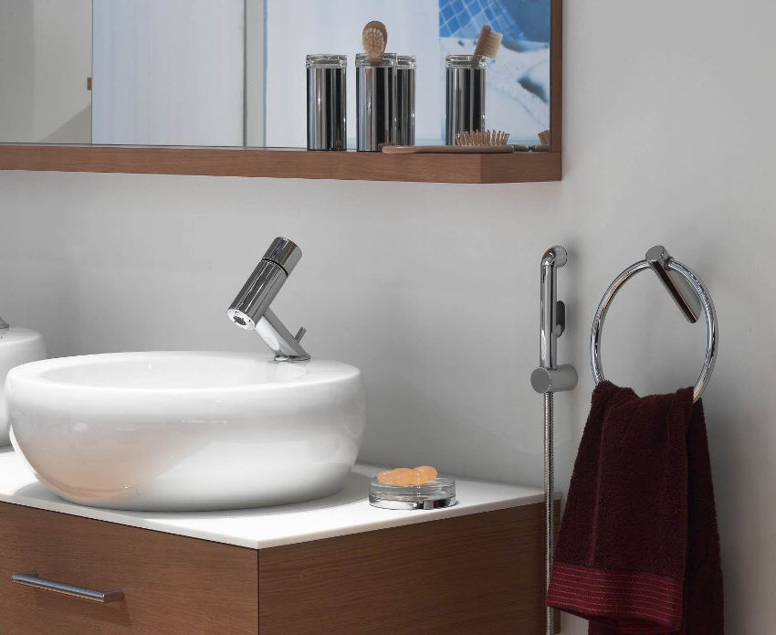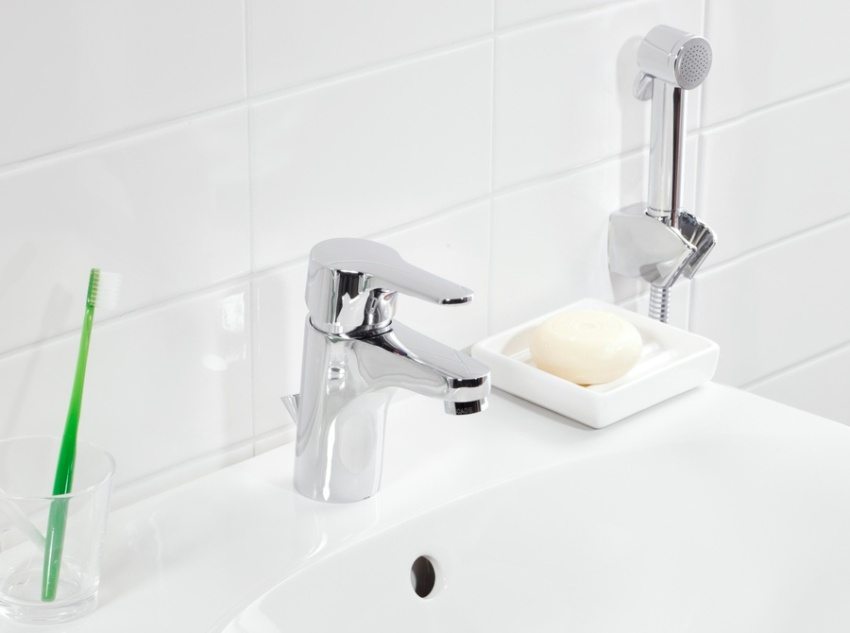 If the bathroom area has a sink, it is recommended to give preference to a hygienic sink shower. The principle of operation of such a mixer with a hygienic shower is as follows: when you open the lever, water enters washbasin through the faucet spout and into the shower hose. But the shut-off valve prevents water from flowing out of the shower head until you press the button on the shower head. As soon as water flows out of the watering can, it stops pouring from the mixer spout. This principle of operation allows in any case to shut off the water after the procedures using a lever.