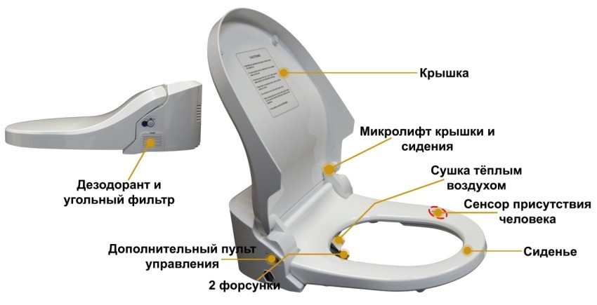 Materials for the manufacture of bidet lids are used with antiseptic properties. The remote control is usually located on the side of the cover itself. The bidet lid features the following options: