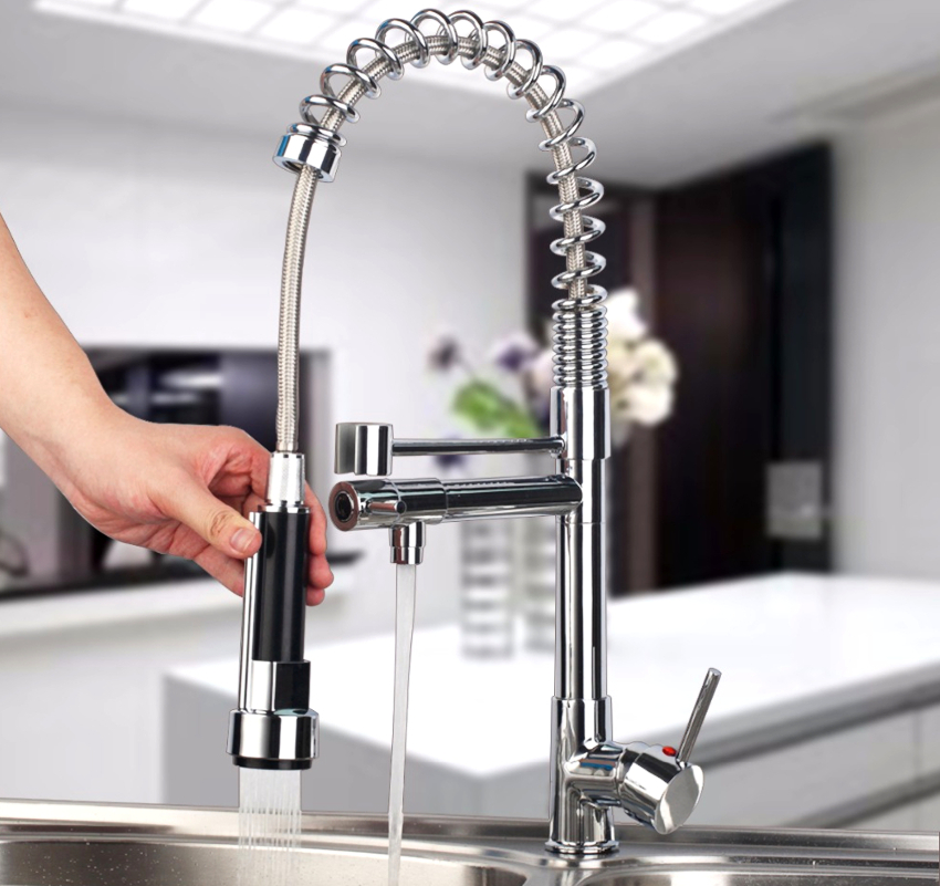 Kitchen faucets with pull-out spray can be attached to the sink, countertop and wall
