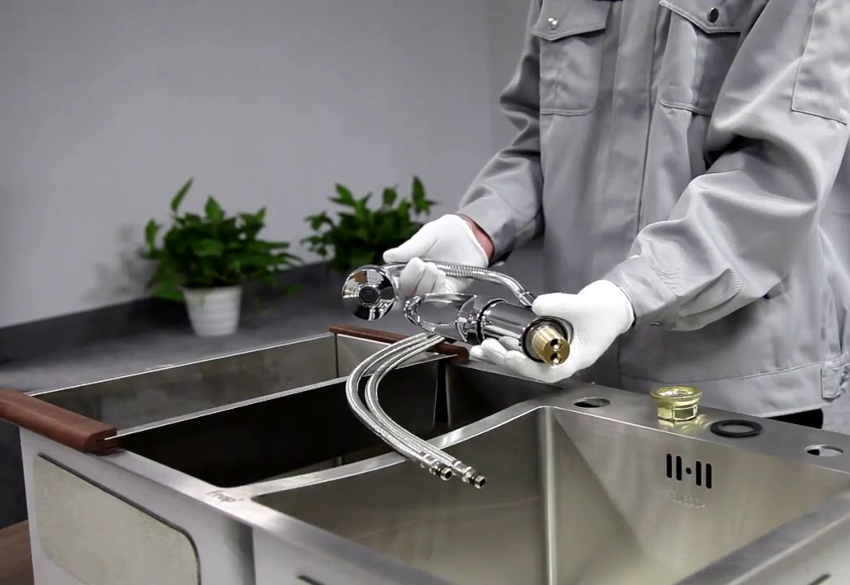 Sink attachment. Most of the sinks offered by manufacturers already have a hole. In this case mixer for a kitchen with a watering can and a spout installed in a strictly designated place.If there is no hole, you must make it yourself using certain tools.