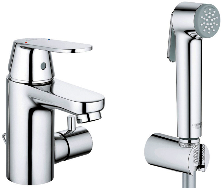 Grohe BauClassic 124434. The model is a hygienic shower equipped with a mixer mounted on a bidet. A wall bracket is included for attaching the watering can. The internal mechanism of the device is presented ceramic cartridge, there is an external chrome finish. The device is characterized by dimensions 105x144 mm, installed vertically using rigid conduits and standard connections (½ ").
