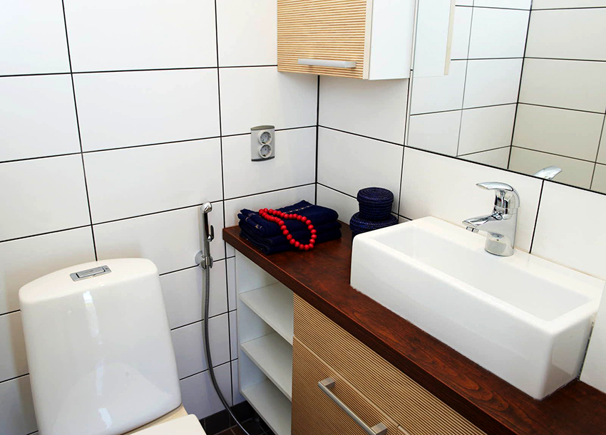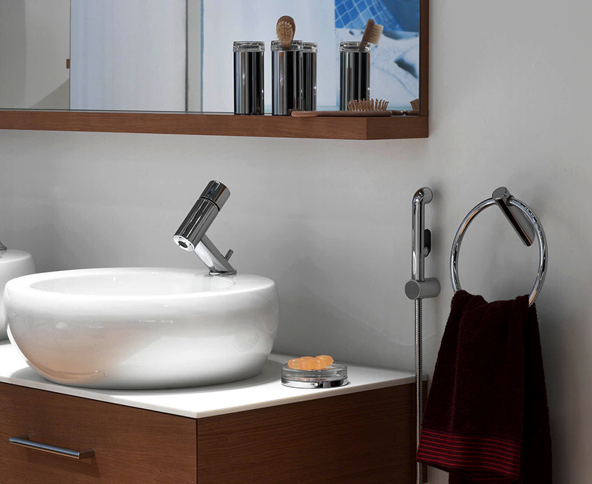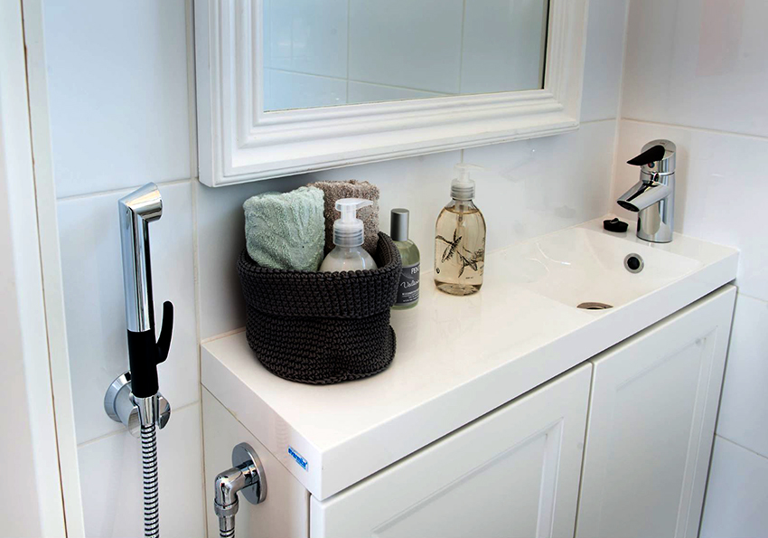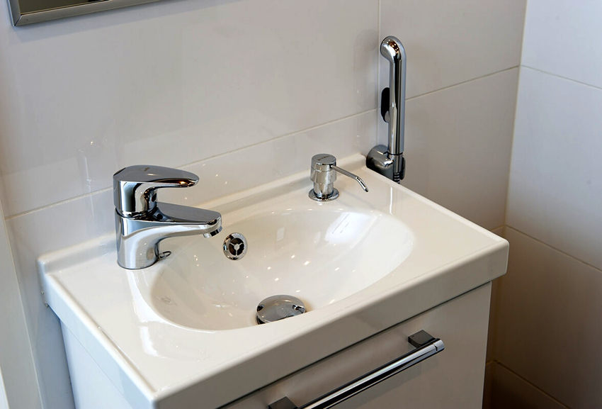 A faucet for a washbasin with a hygienic shower is most often used in a situation where the sink is located near the toilet bowl, which can be found in most bathrooms. For a more harmonious and convenient location, it is recommended to think over the arrangement of plumbing fixtures even at the stage of planning a repair.