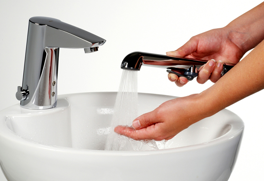 To begin with, the tap is turned on, through which water is supplied to the sink. It is at this stage that the temperature of the water flow is adjusted.