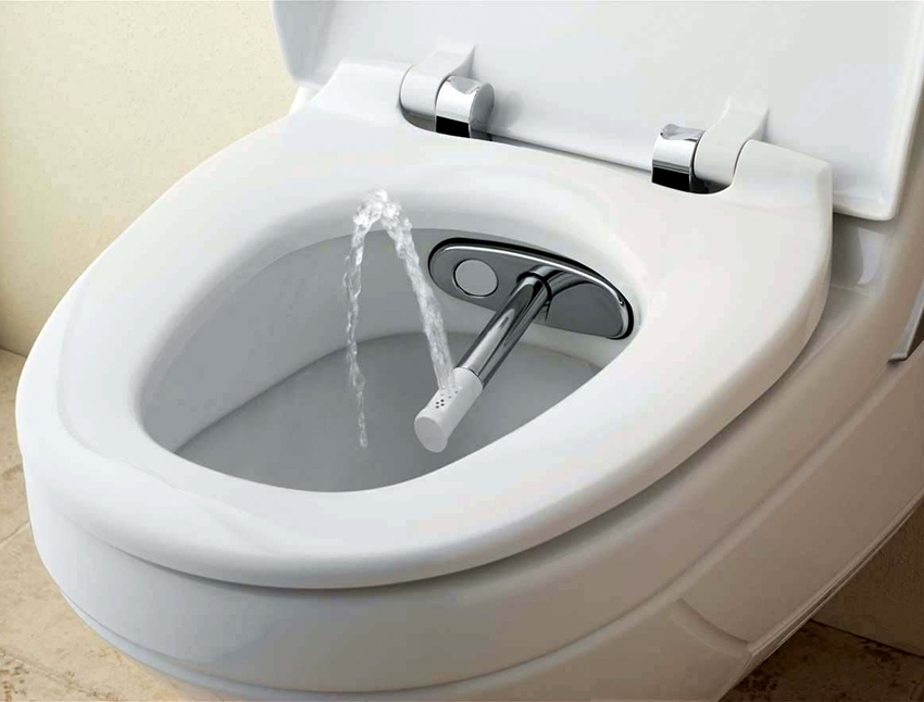 The stool with bidet function is one of the trendy accessories. It is equipped with a control panel with built-in bidet and hairdryer. The design is versatile and can be installed on most toilet bowls. Hot and cold water supply will be required to the lid. The disadvantage is the rather high price of the device, which is almost equal to the cost of a standard toilet.