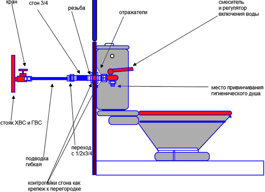 A feature of this design is the attachment directly to the surface of the toilet bowl, which occurs through the hole between the toilet seat and the lid. In most cases, a special mounting bracket is included with the device. A toilet shower consists of the following parts: