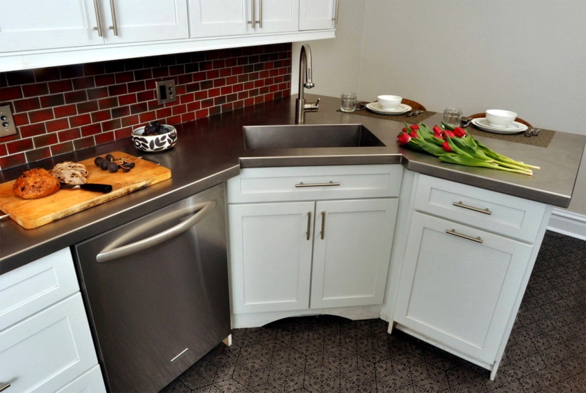Installing a sink in the corner of the kitchen saves a lot of space. As a result, this makes it possible to install a more dimensional tabletop. The freed up space can be used for other purposes, for example, equip additional drawers for storing kitchen utensils.