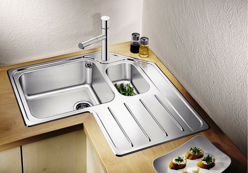 A single design option is most widely used in the domestic market. This is due to the fact that such sinks take up much less space, which is an advantage for standard kitchens that do not have a large supply of free space. A double corner sink for the kitchen, among other things, is more expensive.