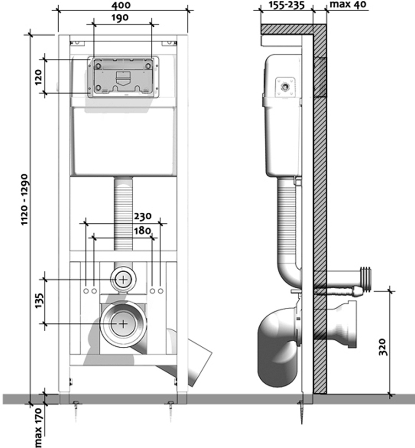 Installations save space and hide drains: all pipes and communications remain out of sight and are placed in the wall