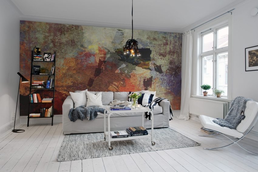 In a small apartment or living room, do not cover one or more walls with panoramic wallpaper. At close range, there will be no effect, and the room itself will become even smaller and more uncomfortable. But single monochrome or with a bright color accent photo wallpapers of a small format will be quite appropriate. You can also use standard 3D wallpaper with abstract or geometric prints, but only cover one wall with them. For example, if the room is narrow and long, a longer wall is pasted over with them. Due to this, the space will become wider, and its overall proportions will even out.