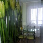 Romantic people will appreciate in their own kitchen realistic images of compositions of tulips, roses, chrysanthemums and other flowers. Such a drawing will become a real decoration of the space. He is able to soften the strict interior, bringing a touch of tenderness and warmth to it, as shown in the photo in the interior in the kitchen of photo wallpaper.