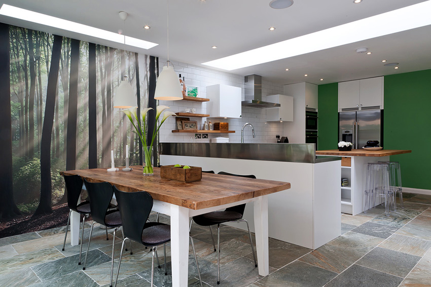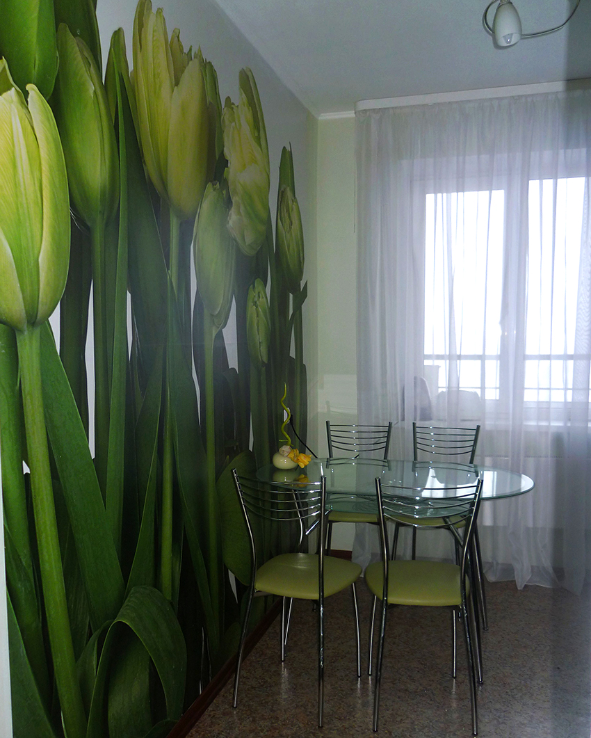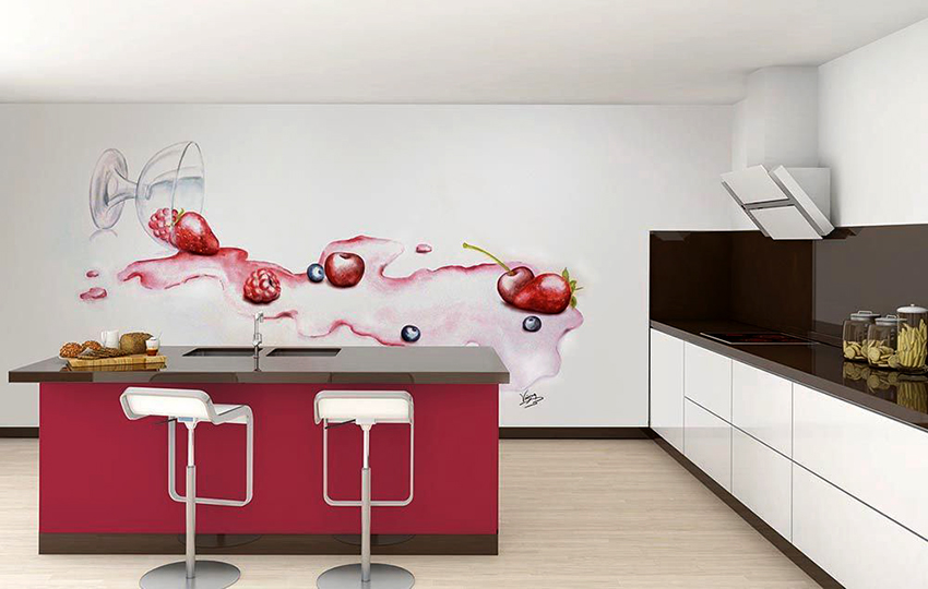 The second option also involves traditional paint application. However, the painted surface is dried by ultraviolet rays. The result is a strong and durable coating, represented by a matrix of polymers. This picture of wallpaper for the kitchen is completely safe for humans. The coating is resistant to any operational loads and influences.