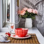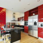 A bright expressive kitchen set will be best combined with photo wallpaper in neutral colors. This can be an original ornament, macro photography of flowers or a sketch drawing of an old city.