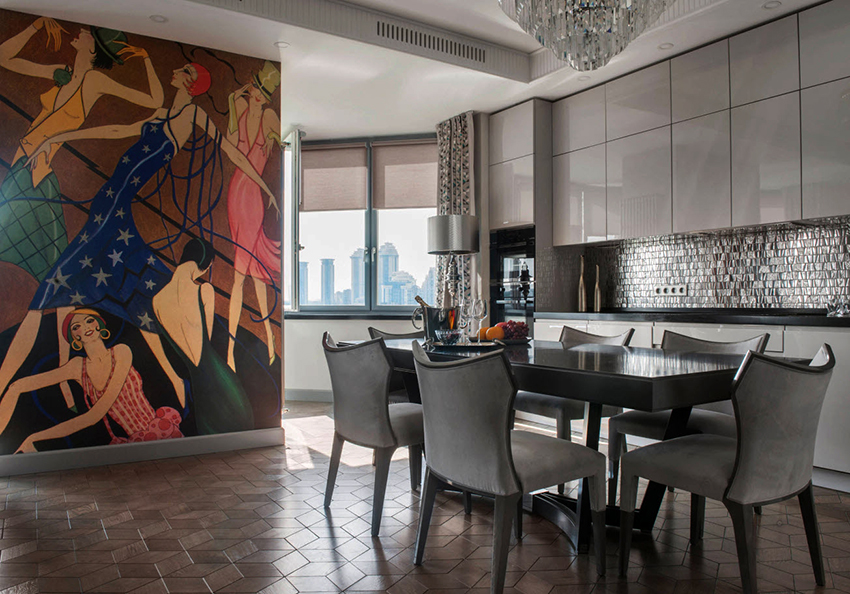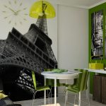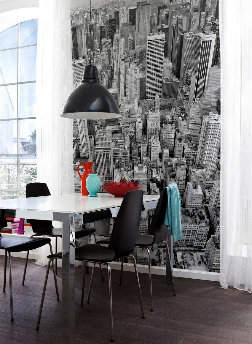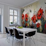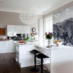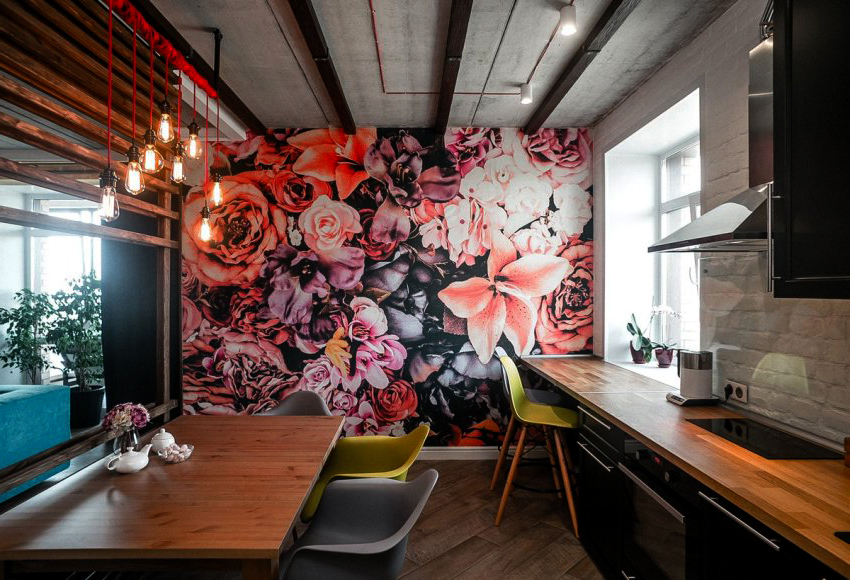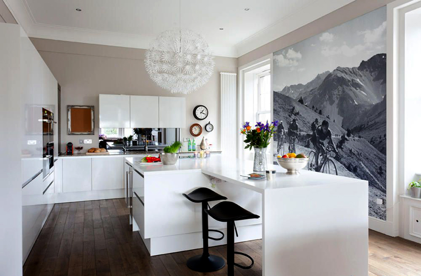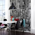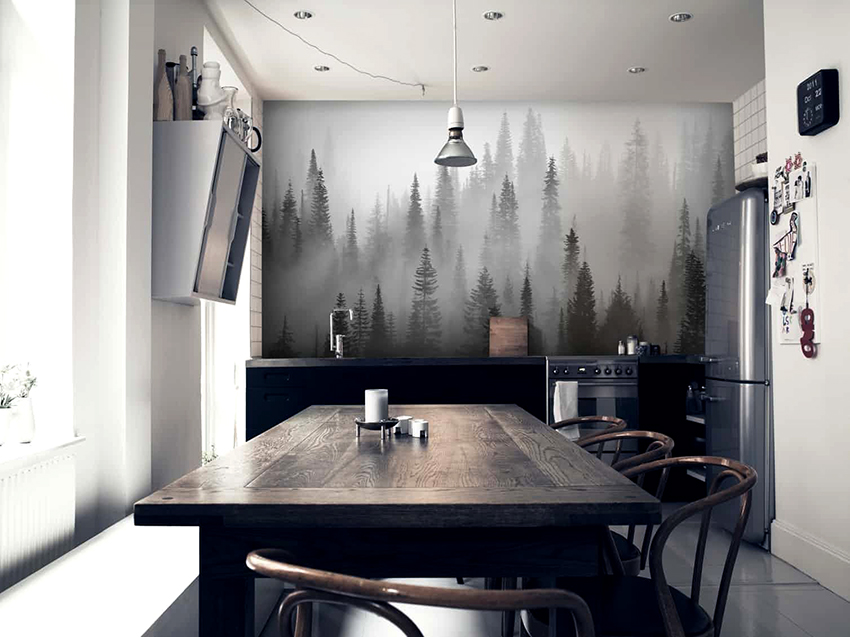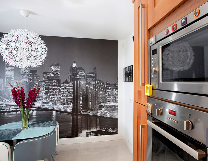 Vibrant images should be “reassured” with plain furniture and neutral textiles. When using black and white wallpaper or shaded prints, balance the design by adding vibrant decor. Different options are shown in the photo of kitchen design with photo wallpaper.