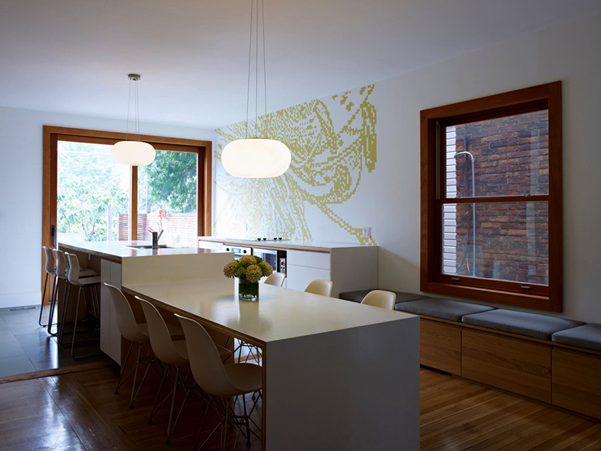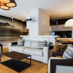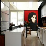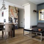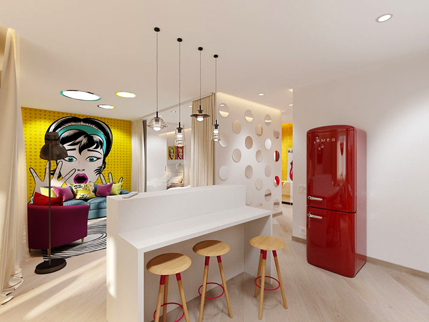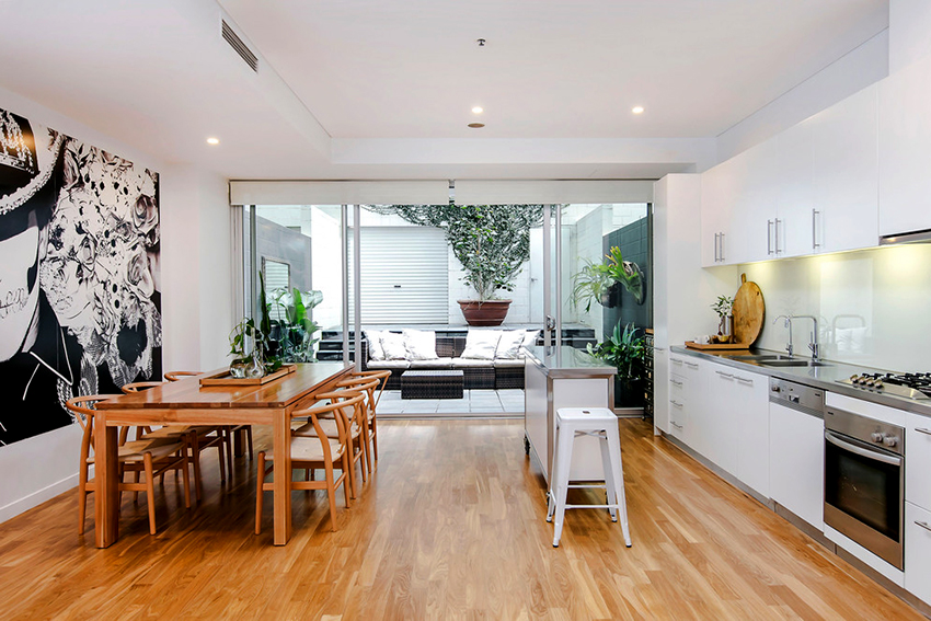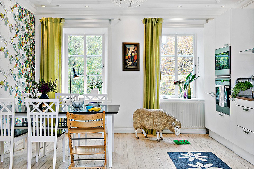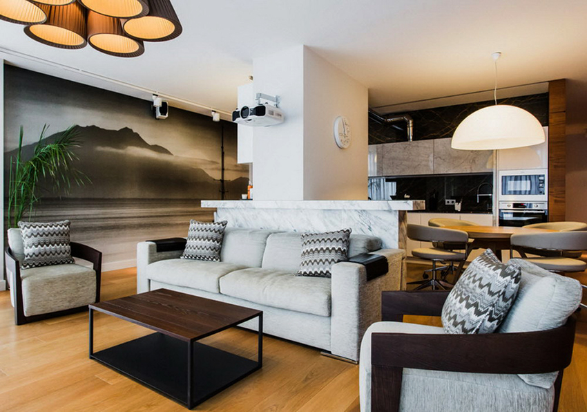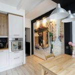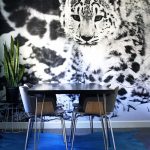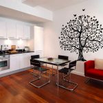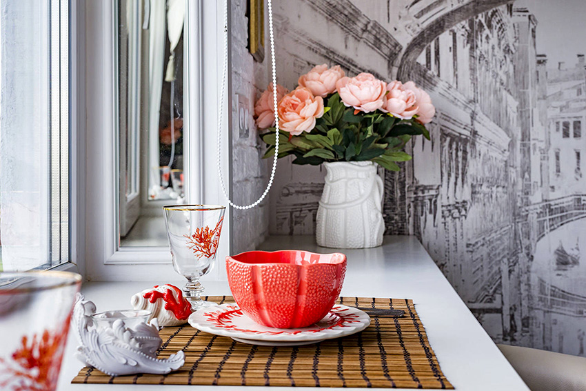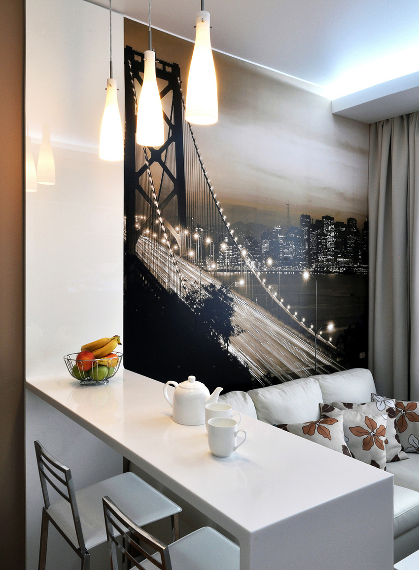 Vibrant images should be “reassured” with plain furniture and neutral textiles. When using black and white wallpaper or shaded prints, balance the design by adding vibrant decor. Different options are shown in the photo of kitchen design with photo wallpaper.