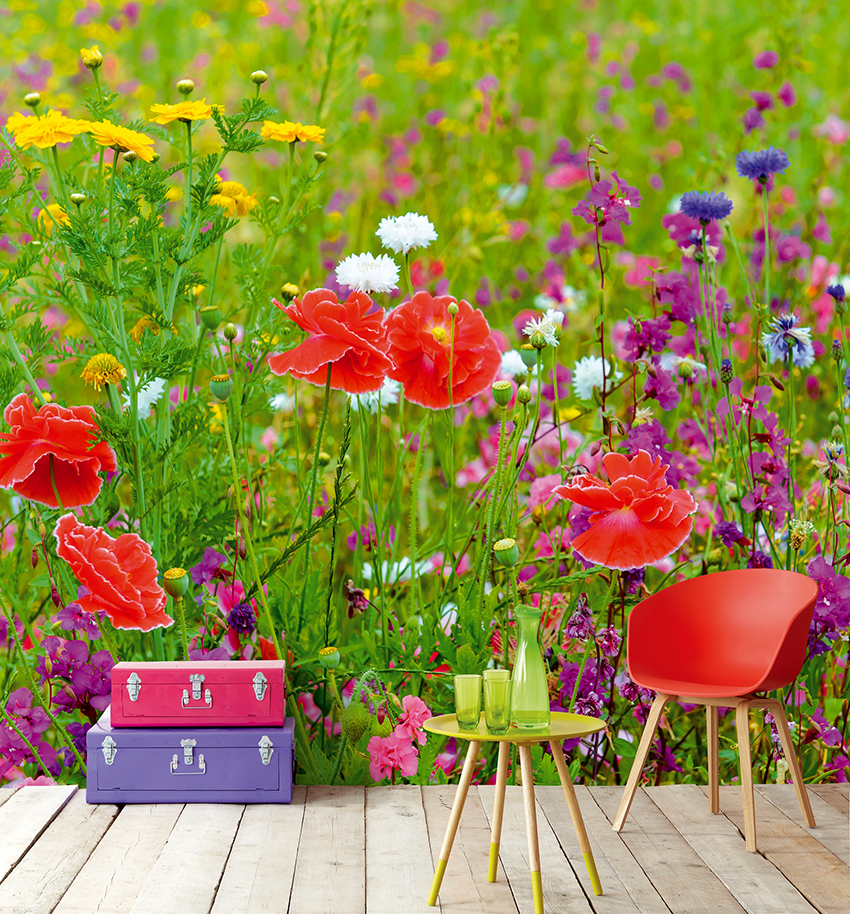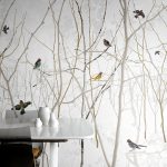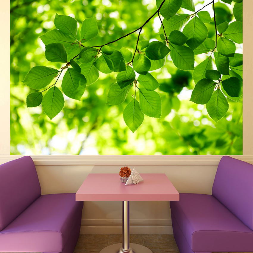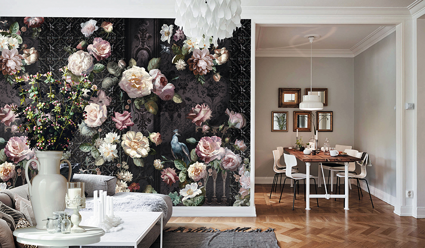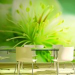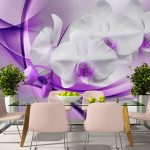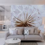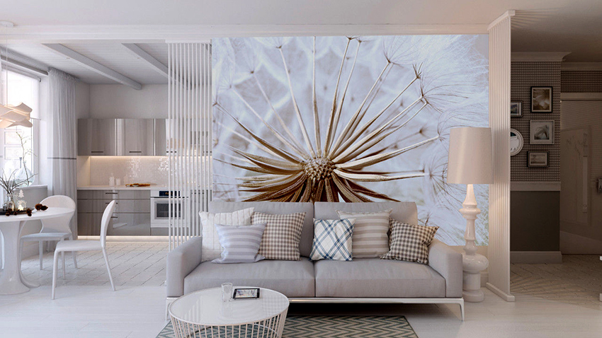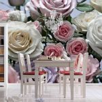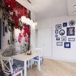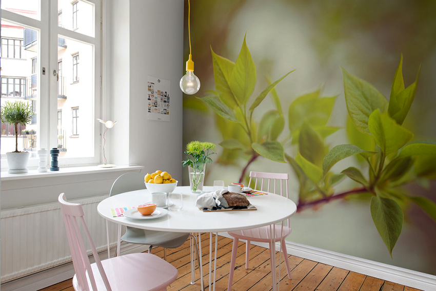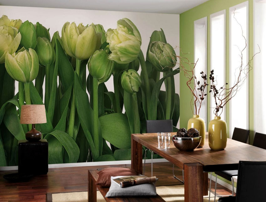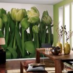 Photomurals with a landscape theme, where lush greenery and bright colors prevail, are best combined with the white, beige or pearl gray tone of the rest of the wall covering. For images using subtle and soft colors, contrast can be created in the form of richer and more vibrant wall designs. For example, a photo wallpaper with a composition of white or pink tulips, delicate magnolias can be combined with a noble wine shade of ordinary wallpaper.