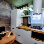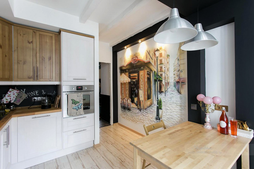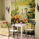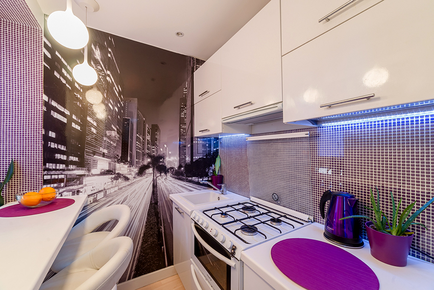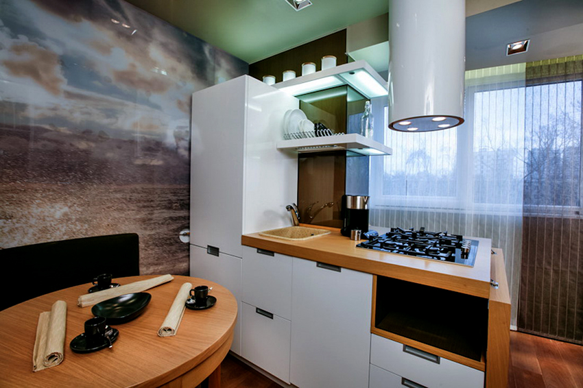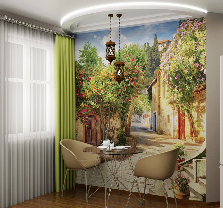 Deserved popularity among the owners of Khrushchevs was gained by expanding photomurals for the kitchen, depicting a view from the window. This option allows you to create an additional artificial window in the room, which adds illusory light and increases the size of the room. The wallpaper is small, which is determined by the specifics of the plot. This perspective image should be placed on the wall near the table. The room should be well lit. The best effect in this case will be created by spotlights.