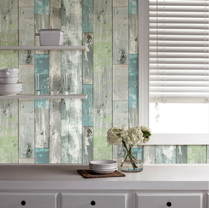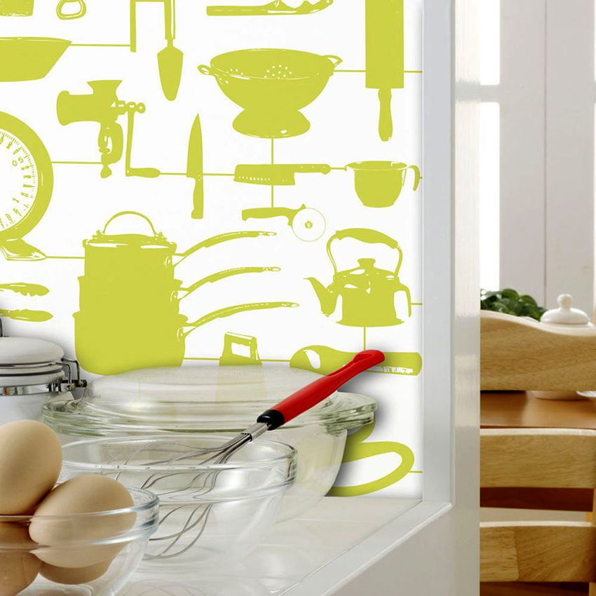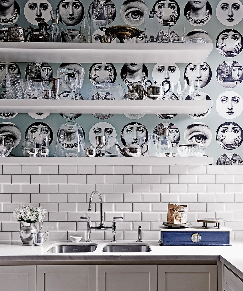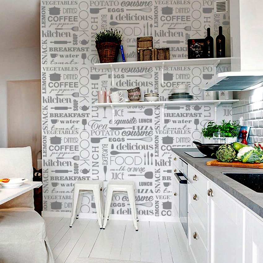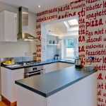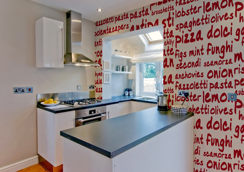 A limited, small kitchen space can be visually enlarged by using wallpaper with specific images.