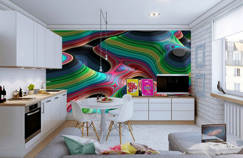 3D wallpaper for walls in the kitchen can be simple, LED and fluorescent. The former are divided into standard, large-sized and occupying the entire wall, single, small-sized drawings and panoramic canvases with a three-dimensional realistic image.LED wallpaper 3D format can glow in the dark and periodically change the image, which is carried out thanks to a built-in microcircuit with many small multi-colored bulbs.