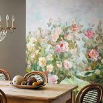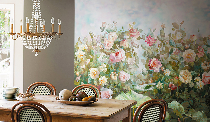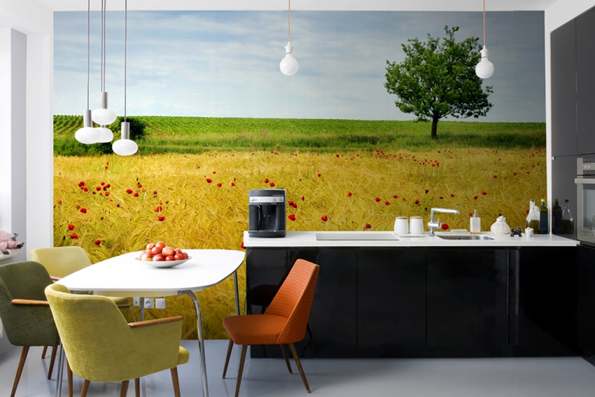 Wallpaper overlooking the garden will add a romantic mood to the kitchen interior. Blooming gardens, trees with fruits, numerous shrubs and endless fields of flowers will look organically indoors.
