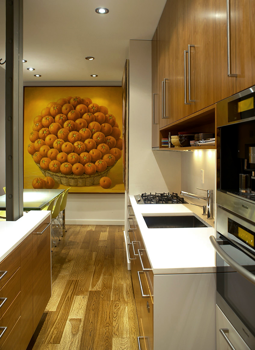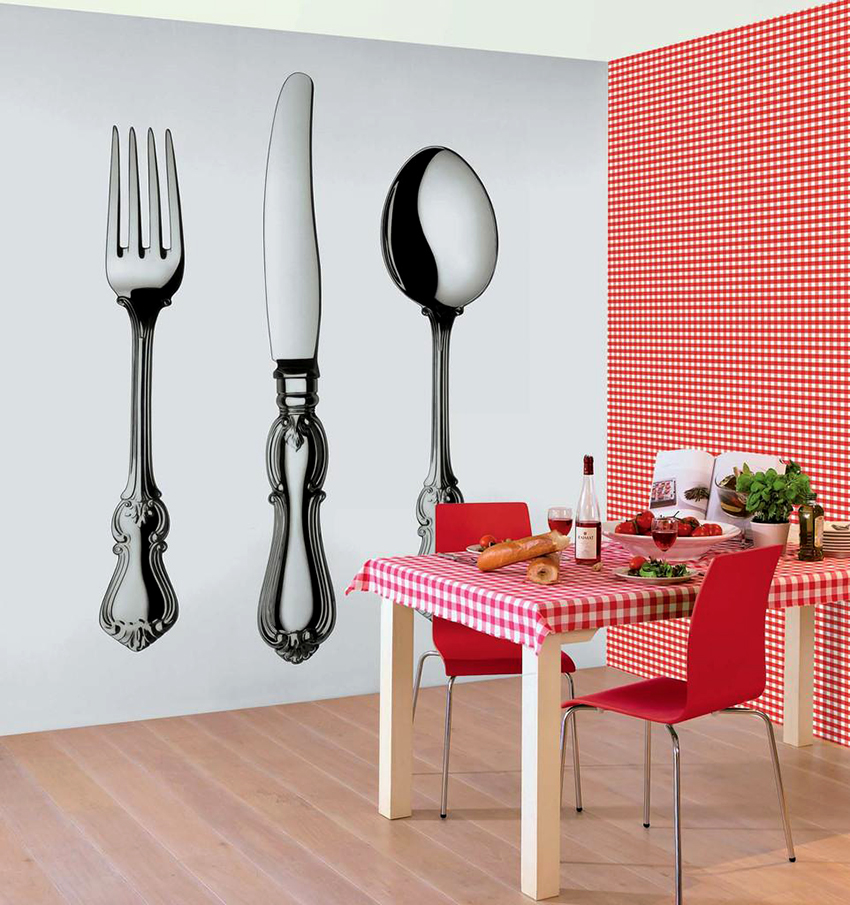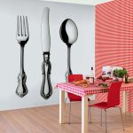 Wall murals with reproductions of famous still lifes with various kitchen utensils and food will look organic in the interior of the room.